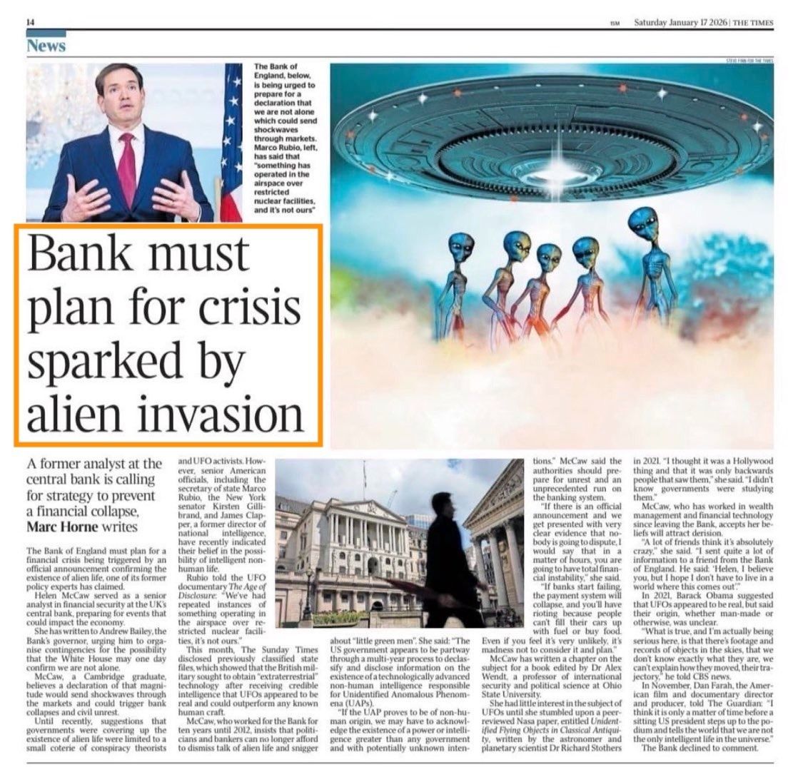 A former Bank of England analyst urges the central bank to prepare for alien disclosures (yes, aliens!) that could spark market crashes.